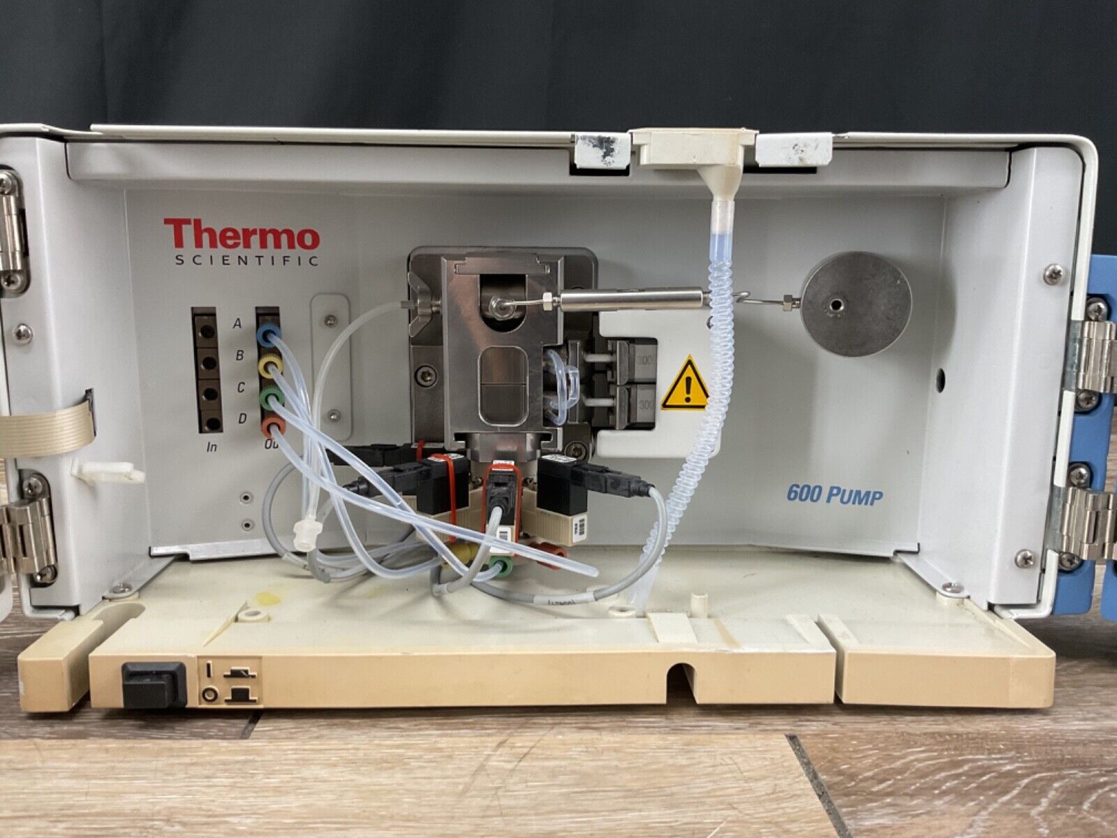 The Thermo Scientific Accela 600 Pump is in good condition, showing normal signs of use. The indicator lights are bright and vibrant, and the pump has been tested for functionality. Please note that a standard power cable is required but is not included with the purchase. However, it may be available upon request, so feel free to ask.